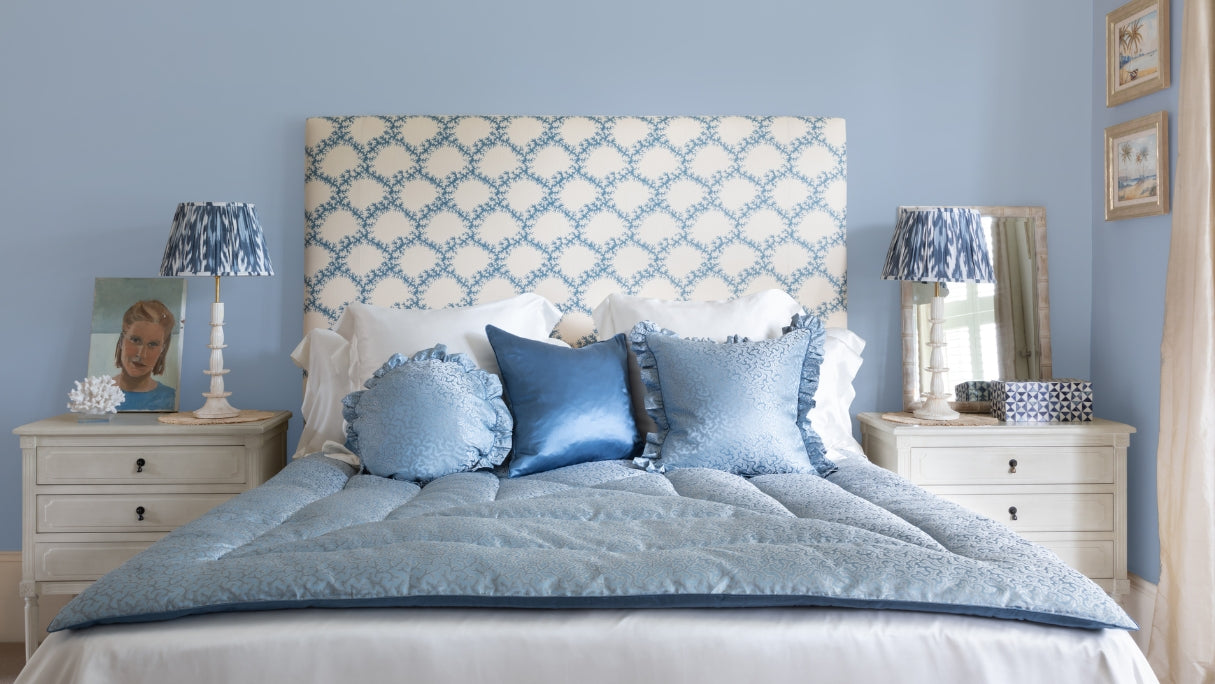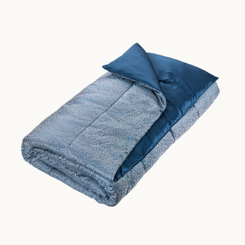 Add a tranquil touch to your bedding set with our luxurious silk blue eiderdown from the Coral Fern collection. Designed in collaboration with expert colour consultant and designer, Vanessa Konig, this gentle blue silk bed cover features a unique pattern, with elegant piping, ruffle and frill details. Filled with bamboo, the blue silk eiderdown features a soft, comfortable feel and boasts a stylish appearance. Purchase the blue eiderdown as a standalone piece, or alongside the full bedding set from the wider Coral Fern collection.