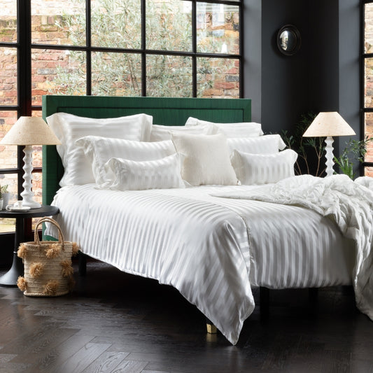 The Lancaster bedding collection features a classic stripe design in our enduringly popular signature ivory colourway. Made from the finest pure long strand mulberry silk, this jacquard woven pattern is a perfect way to imbue any interior design scheme with a subtle sense of style.