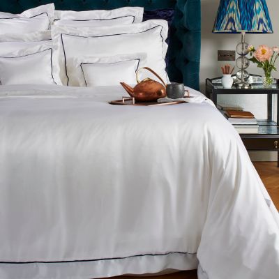 Bring the French Riviera into your home with the St Tropez collection. This white silk bedding set evokes the essence of a luxury hotel experience, offering a wonderfully white hue that is perfectly contrasted by a deep navy trim. This subtle detail helps to add a sophisticated flair reminiscent of one of the world’s finest travel destinations. This opulent collection helps to transform your bedroom into a serene oasis, embodying the effortless charm of coastal living whilst remaining versatile enough to complement a range of design schemes. Whether it’s a full bedding set, or just the pillows, each piece works to offer exquisite comfort and bring a timeless, polished look.