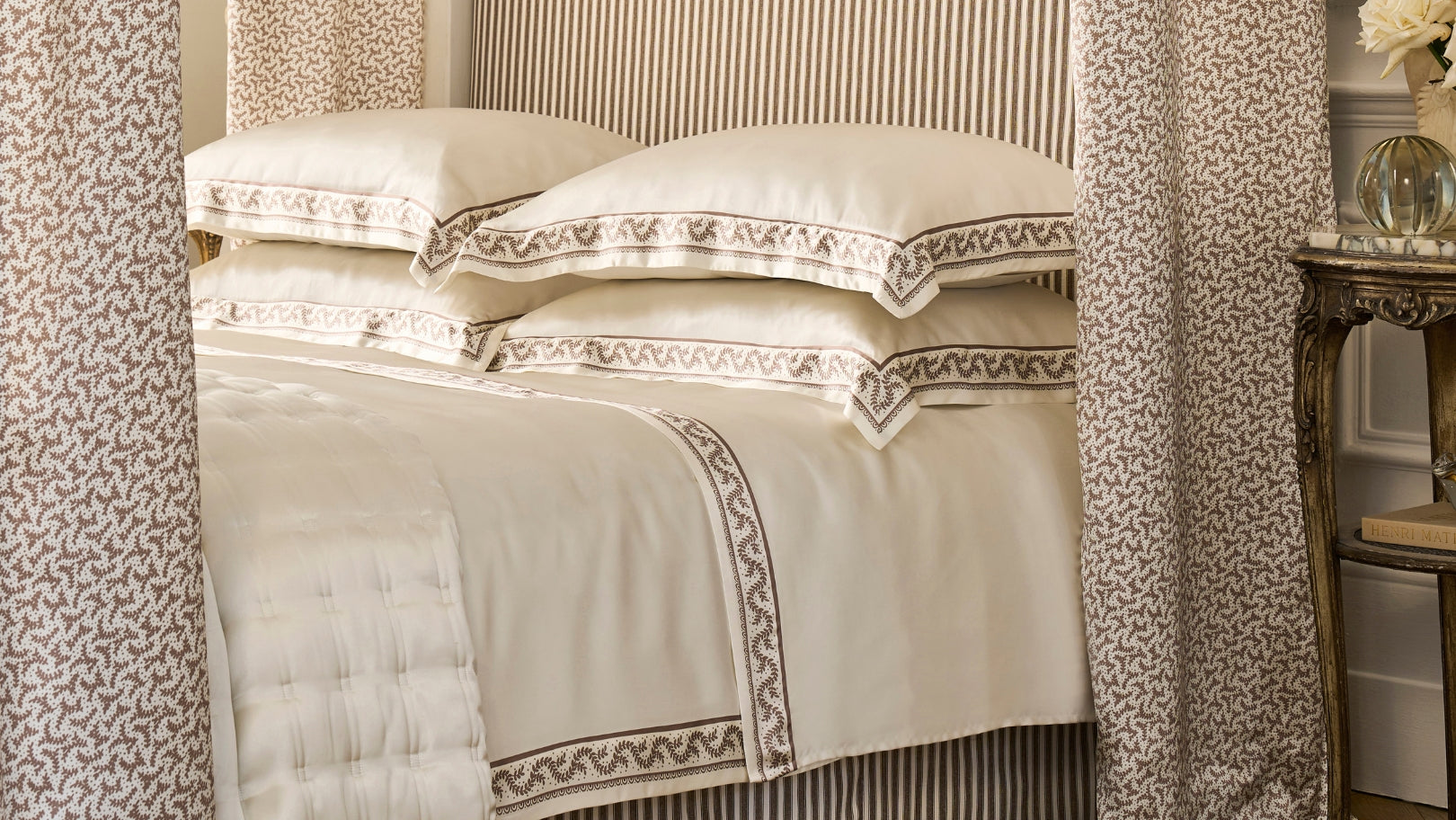 The Fern flat sheet is designed to complete the collection with effortless elegance. Crafted from 100% mulberry silk, it features the delicate fern motif printed along the edge, framed by mocha detailing. When folded back over the duvet cover, it creates a beautifully framed finish that enhances the bed with a refined, luxurious touch.